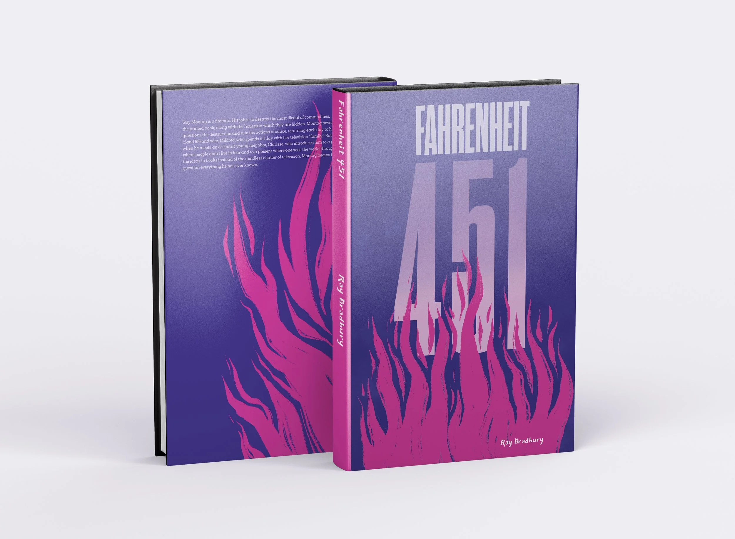 The fire engulfs the front and continues to burn on the back. The texture of the fire is graphic and eye-catching to get this book picked up. A classic book that all should read; the striking colors and bold type being covered by the fire create a feeling of urgency.
